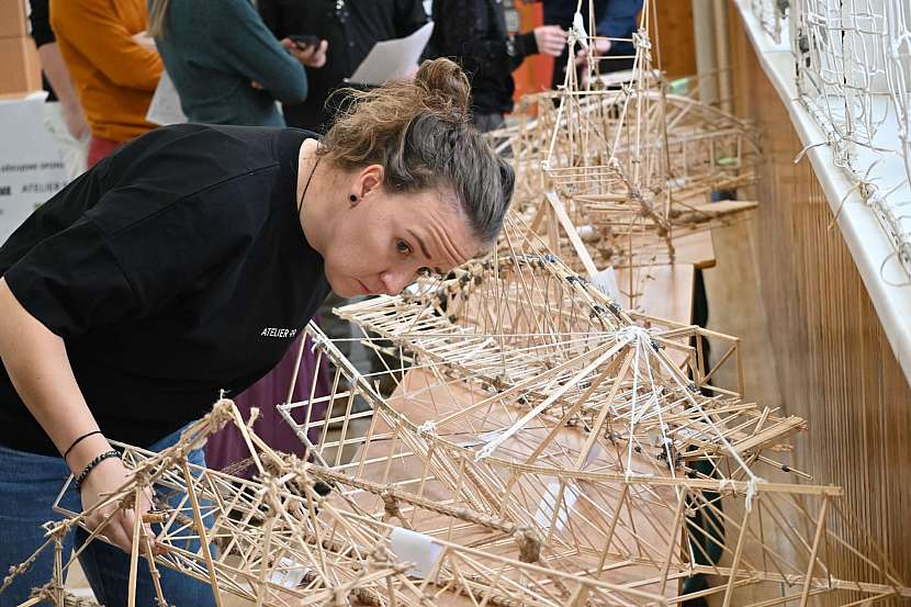 Soutěžící měli za úkol postavit most přímo na místě z materiálů, které obdrželi při registraci. Jaké překvapení je čekalo tentokrát? K dispozici měli různé druhy kartonu, dřevěné hranaté profily a špejle, provázek a lepicí pásku.