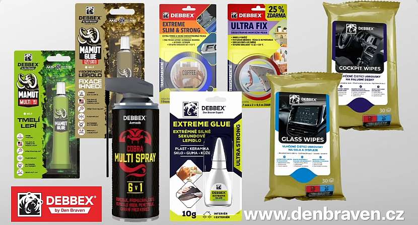 Pět z vás může vyhrát balíček produktů DEBBEX by Den Braven. Najdete v něm lepidlo nahrazující hřebíky, šrouby a nýty, vysokopevnostní lepidlo, oboustranné montážní pásky, sekundové lepidlo, univerzální sprej 6 v 1 i vlhčené čistící ubrousky.